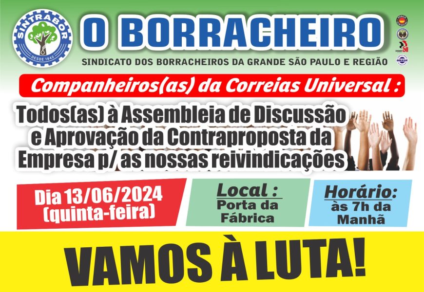 Comunicado de Convocação para Assembleia de Trabalhadores, dia 13 de Junho, às 7h da Manhã, na porta da Fábrica da Correias Universal