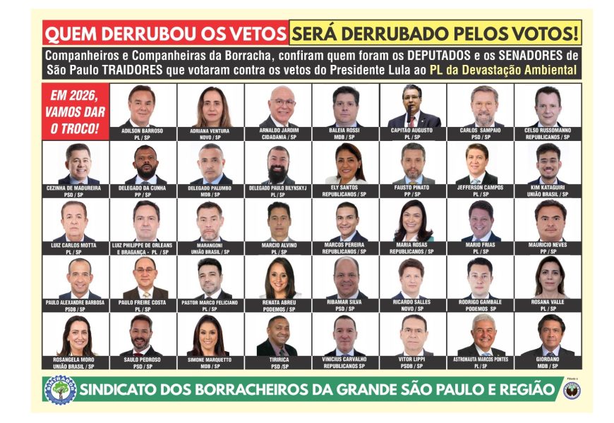 Confiram quem foram os Deputados e os Senadores de São Paulo traidores que votaram contra os vetos do Presidente Lula ao PL da Devastação Ambiental
