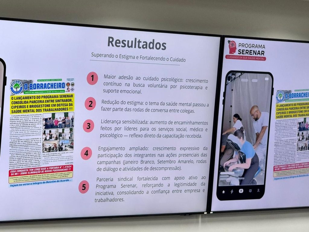 A abertura da reunião aconteceu com uma explanação do presidente da empresa, Lafaiete Coutinho, fazendo uma breve análise, abordando através de uma linha do tempo, os 85 anos da Bridgestone em nosso país, enfatizando o compromisso com a sustentabilidade, a participação na COP30 e os desafios com a concorrência assimétrica dos pneus importados. Ato contínuo, o Gerente de Relações Trabalhistas, Cristiano Tripiquia Lemes, dissertou detalhadamente o Programa Serenar desde a sua implantação até o estágio atual, onde as ações de orientação psicológica, assistência social, consultoria financeira e assessoramento jurídico estão contribuindo decisivamente para erradicar os riscos psicossociais aos trabalhadores e trabalhadoras da fábrica. Antes da fala do ministro, o nosso presidente Márcio Ferreira fez uma retrospectiva da motivação do programa que teve como ponto de partida as negociações do Acordo Coletivo de 2024, onde ficou agendada a discussão desse tema em janeiro de 2025, bem como a regulamentação da Portaria 1.419 da NR 01 , a ocorrência de um suicídio na fábrica e outra tentativa desse ato extremo. Dessa forma, e com o comprometimento da direção da Bridgestone visando a concretização de uma estratégia conjunta para a preservação da saúde mental dos funcionários, o projeto foi se estruturando com a participação dos Cipeiros e a adesão dos companheiros e companheiras, tanto do chão de fábrica como dos cargos de chefia, culminando com a implantação do Programa Serenar há 6 meses. Da parte da Diretoria do nosso Sindicato estamos empenhados no sucesso total dessa empreitada, pois a saúde do trabalhador tem pressa e a saúde mental é fundamental.