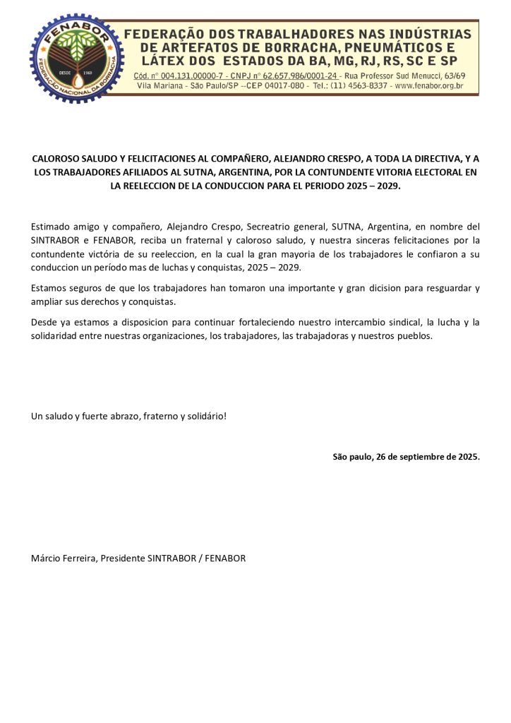 SAUDAÇÕES CALOROSAS E FELICITAÇÕES AO COMPANHEIRO ALEJANDRO CRESPO, A TODA A DIRETORIA E AOS TRABALHADORES AFILIADOS AO SUTNA, ARGENTINA, PELA CONTUNDENTE VITÓRIA ELEITORAL NA REELEIÇÃO DA LIDERANÇA PARA O PERÍODO 2025-2029. Prezado amigo e colega Alejandro Crespo, Secretário-Geral dO SUTNA, Argentina, em nome do SINTRABOR e da FENABOR, aceite nossa fraterna e calorosa saudação e nossos sinceros parabéns pela retumbante vitória em sua reeleição, na qual a grande maioria dos trabalhadores confiou à sua liderança mais um período de luta e conquistas, o período 2025-2029. Estamos confiantes de que os trabalhadores tomaram uma decisão importante e significativa para salvaguardar e ampliar seus direitos e conquistas. Estamos à disposição para continuar fortalecendo o intercâmbio sindical, a luta e a solidariedade entre nossas organizações, os trabalhadores e o nosso povo. Um abraço caloroso, fraterno e solidário! São Paulo, 26 de setembro de 2025. Márcio Ferreira Presidente do SINTRABOR / FENABOR
