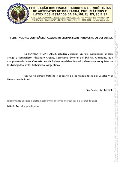 FENABOR e SINTRABOR saúdam e desejam feliz aniversário ao grande amigo e companheiro Alejandro Crespo, Secretário Geral da SUTNA, Argentina, que você tenha muitos mais anos de vida, lutando e defendendo os direitos e conquistas dos trabalhadores argentinos.